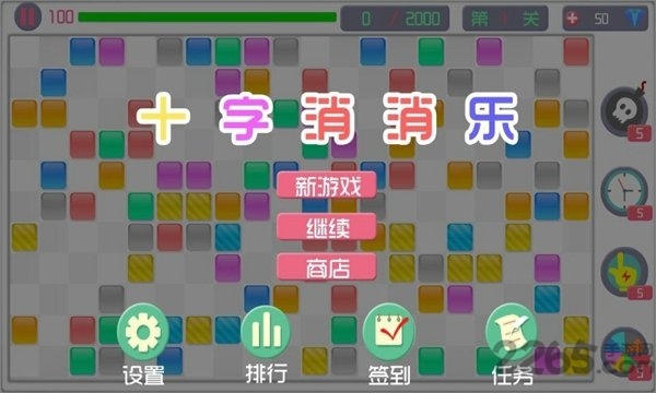 《十字消消乐》,玩家通过连接两个或多个颜色相同方块的十字线的中心,便能成功消除方块,消除的方块越多得分也就越高,连续的消除可以触发连击效果,更有时间、爆炸、彩虹、上帝之手等道具,高分垂手可得!