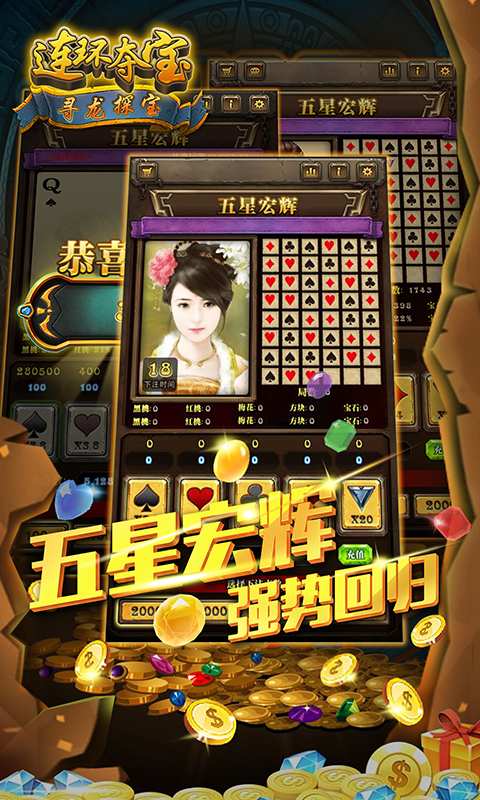 寻龙探宝内购破解版是经典的消除类夺宝游戏,寻龙探宝游戏结合了游戏设投注,游戏和探宝三种玩法,同时配合简单粗暴的剪刀石头布,悠闲娱乐的五星宏辉,让玩家得到完美的游戏体验.