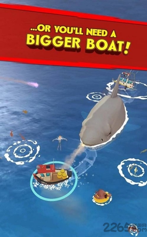 驾驶船只时,你需要高速航行去拯救尽可能多的泳者,来提升船只规模。你船的规模越大,就越容易击败巨鲨。特别是,巨鲨也会由于吞食越来越多的鱼类、浮标、码头木板、泳者……而变得更加庞大……