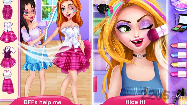 玩家在游戏中饰演因车祸而重生为吸血鬼的女孩,帮助她进行各式各样的打扮,进行普通的校园生活,完成剧情任务,收获自己的爱情故事。玩家将会在游戏中体验不同的趣味游戏感受和玩法,玩家以可以成为专业的设计师,帮助游戏中的女孩打扮各种潮流的装扮和各种美丽的妆容,玩家还可以控制游戏中的角色进行刺激的剧情任务,做出你的各种选择感受游戏的不同结局。