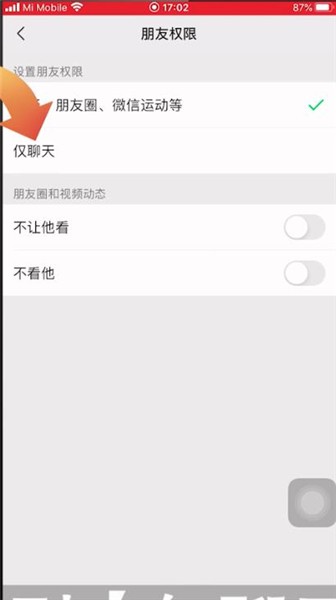 最后在【设置朋友权限】栏选择【仅聊天】即可。