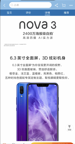 华为nova3屏幕尺寸为6.3英寸的全面屏,屏幕分辨率2340x1080像素,屏幕色彩为1670万色,色彩饱和度为85%(典型值)。