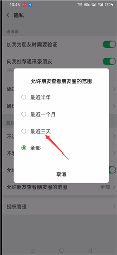 在弹出的窗口选择最近三天,这样就成功设置的三天可见的微信朋友圈。