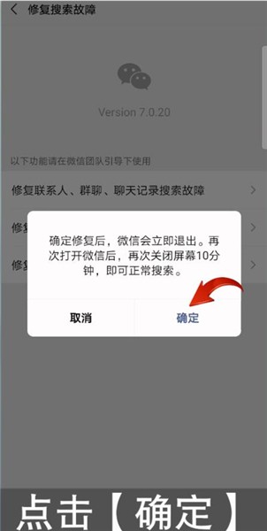 再点击【修复搜索故障】,点击【修复联系人、群聊、聊天记录搜索故障】,最后点击【确定】,待微信关闭数分钟后即可。