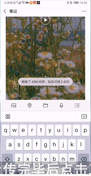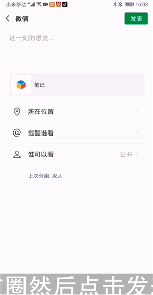 等上传完毕后点击三点图标,点击分享到朋友圈,然后点击发表即可成功发送。