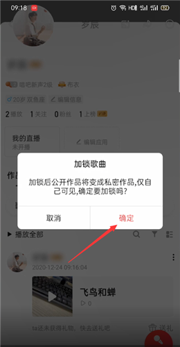 最后点击确定,加锁成功后再点击一次确定,就可以看到在歌曲名字右侧有个锁作品就变成私密了。