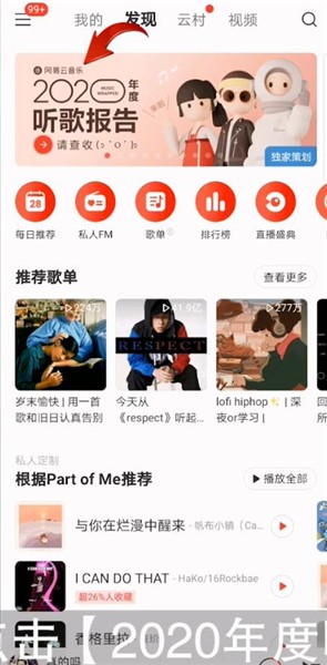 也可以在首页面点击【2020年度听歌报告】活动栏,