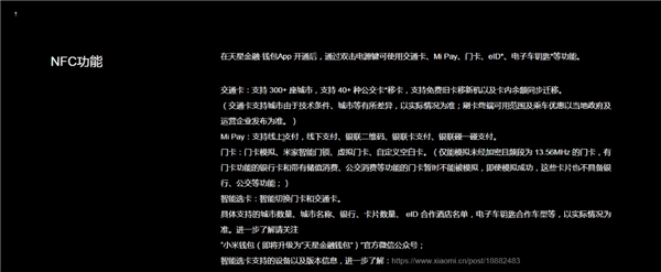 小米11支持NFC功能,在天星金融钱包App 开通后,通过双击电源键可使用交通卡、Mi Pay、门卡、eID、电子车钥匙等功能,支持 300+ 座城市,支持 40+ 种公交卡*移卡,支持免费旧卡移新机以及卡内余额同步迁移。