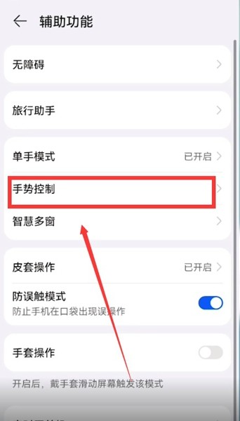 2、选择【手势控制】,找到智能截屏,确认智能截屏已经开启。