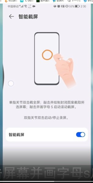 注意:启动手势控制之后我们就可以开启智能截屏了,我们用指关节双击屏幕就是截图,单击屏幕画出各种形状就是这个形状的截图,敲击屏幕画字母s才是滚动截屏哦。