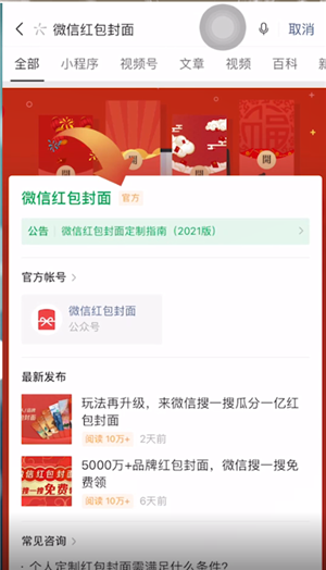 如果想要自定义红包封面的话,首先打开微信app,在搜索栏输入微信红包封面点击搜索,点击该官方号,