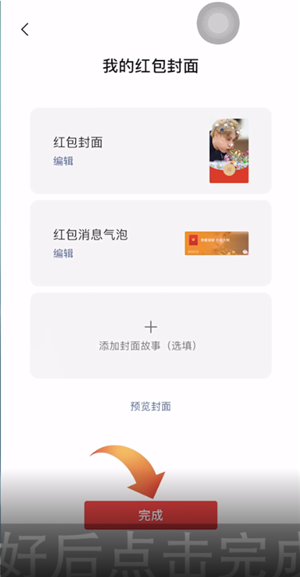 还可以调整照片位置和查看预览封面,设置好后点击完成即可,需要注意的是红包封面有一次修改机会。