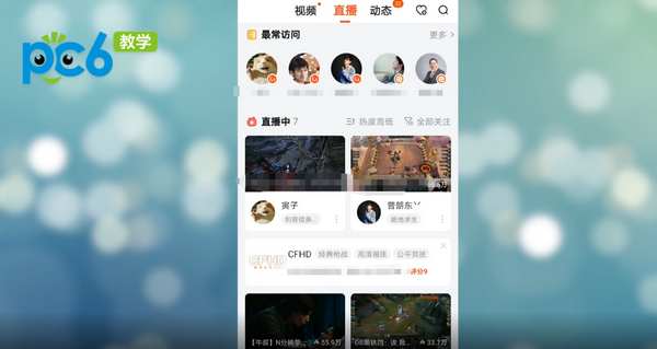 进入主界面之后,点击界面下方的关注选项,然后进入到个人关注的页面。这个页面分为了四个区域,最上方是最常访问的主播,滑动主播头像即可查看更多主播。