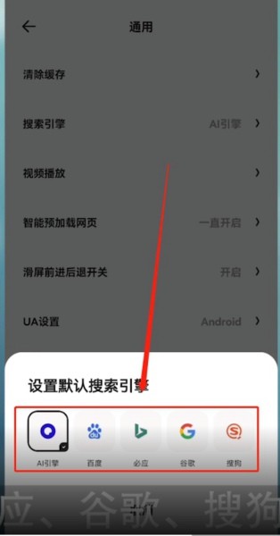 我们在夸克浏览器设置的通用选项之中,可以找到搜索引擎选项,在这里我们可以选择各种搜索引擎。目前我们是可以在夸克可以选择的搜索引擎有al引擎、百度、必应、谷歌、搜狗五个引擎。