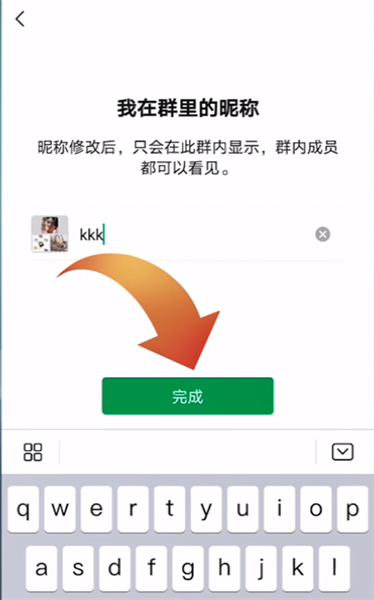 第二步:接下来点击“我在群里的昵称”选项,输入名称后再点击完成就可以修改成功了。