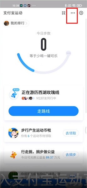 3、进入支付宝运动页面后,点击右上方的三个点;