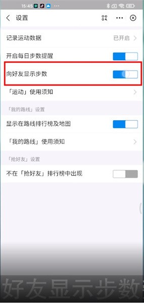 4、点击菜单栏中的设置,再点击向好友显示步数旁的按钮;