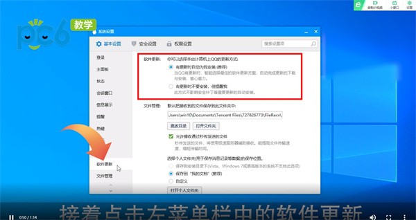2、在主菜单栏中点击设置,接着点击左菜单栏中的软件更新,用户可以自行选择本台计算机qq的更新方式,电脑qq便可以自动升级新版本进行安装或者提醒安装了。