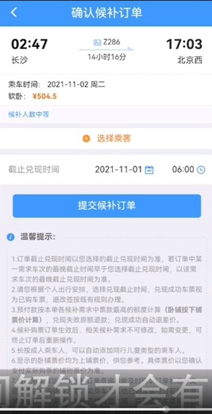 备注:在12306候补购票,是需要先预先付款的,购票成功之后将不会退款,候补失败是会在当天退款的,并且会发送候补失败的信息。