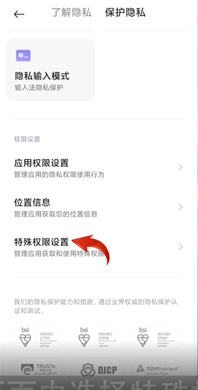 2.在隐私保护中选择保护隐私的设置栏,再在该页面中选择特殊权限设置。