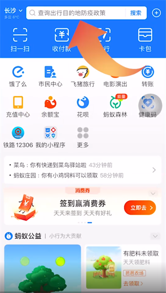 第一步:想要查询名下账户的话,首先打开支付宝app,在支付宝首页点击顶端的搜索栏选项,