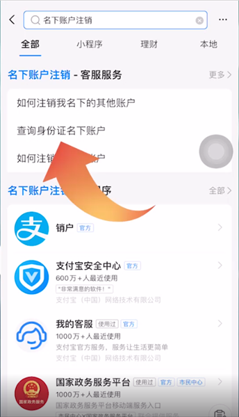 2.输入名下账户注销字样,接着在搜索结果中点击查询身份证名下账户选项,