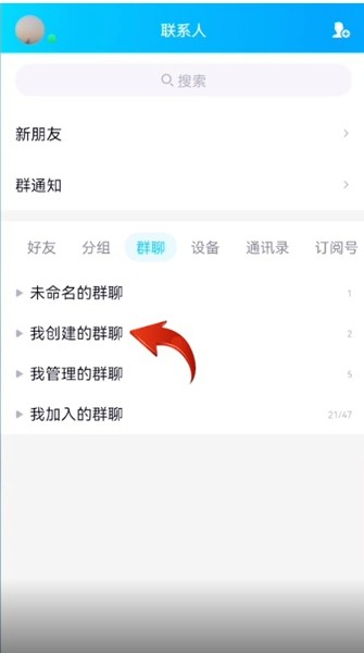 2、在联系人上方选择群聊然后点击我创建的群聊进入。