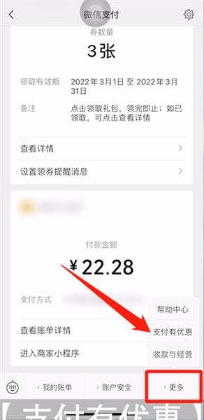 第二步:进入微信支付公众号,点击右下方【更多】图标,再点击【支付有优惠】选项,