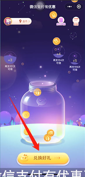 此时在微信支付有优惠页面下方就可以看到【兑换好礼】按钮,点击进入就可以兑换礼品了。
