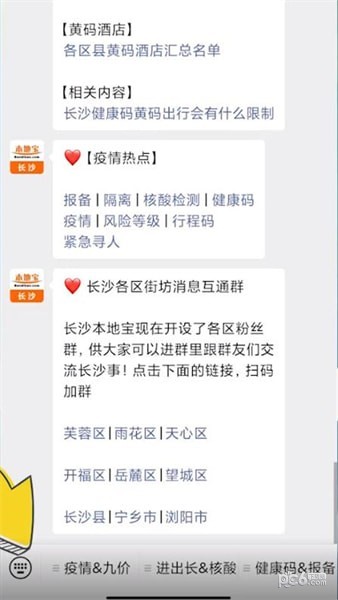 首先打开微信,点击页面上方搜索框,搜索长沙本地宝,点击该公众号进入,点击【发消息】,点击左下角键盘符号,输入并发送【黄码】,点击【健康码申诉咨询号码】,就可以查看详情了。