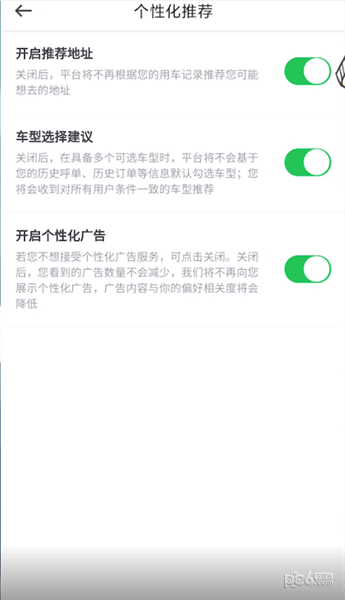 首先打开曹操出行,点击页面左上角个人头像,点击页面左下角【设置】,选择【个性化推荐】进入,滑动按钮关闭【开启推荐地址】就可以了。