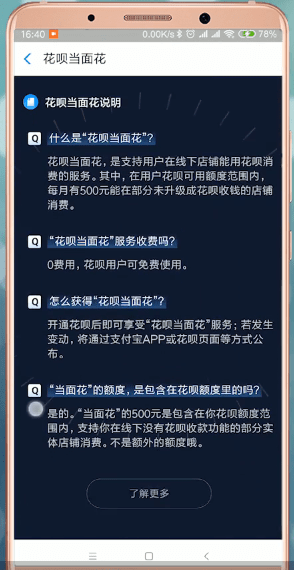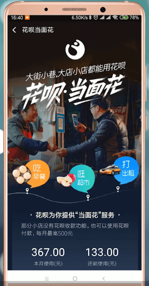 花呗当面花,是支持用户在线下店铺能用花呗消费的服务,其中,在用户花呗可用额度范围内,每月有500元能在部分未升级成花呗收钱的店铺消费。