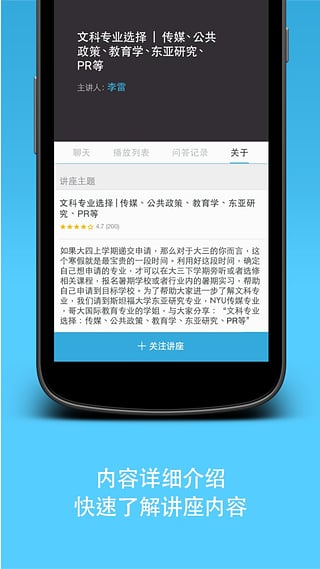 讲座主题包含美国顶尖名校申请,托福,GRE,GMAT,SAT,AP,留美职业规划,留学生活等相关领域 。现在已有超过1500名来自美国顶尖高校的导师注册成为小板凳用户,他们将问您呈现最全面最真实的经验交流及互动讲座。