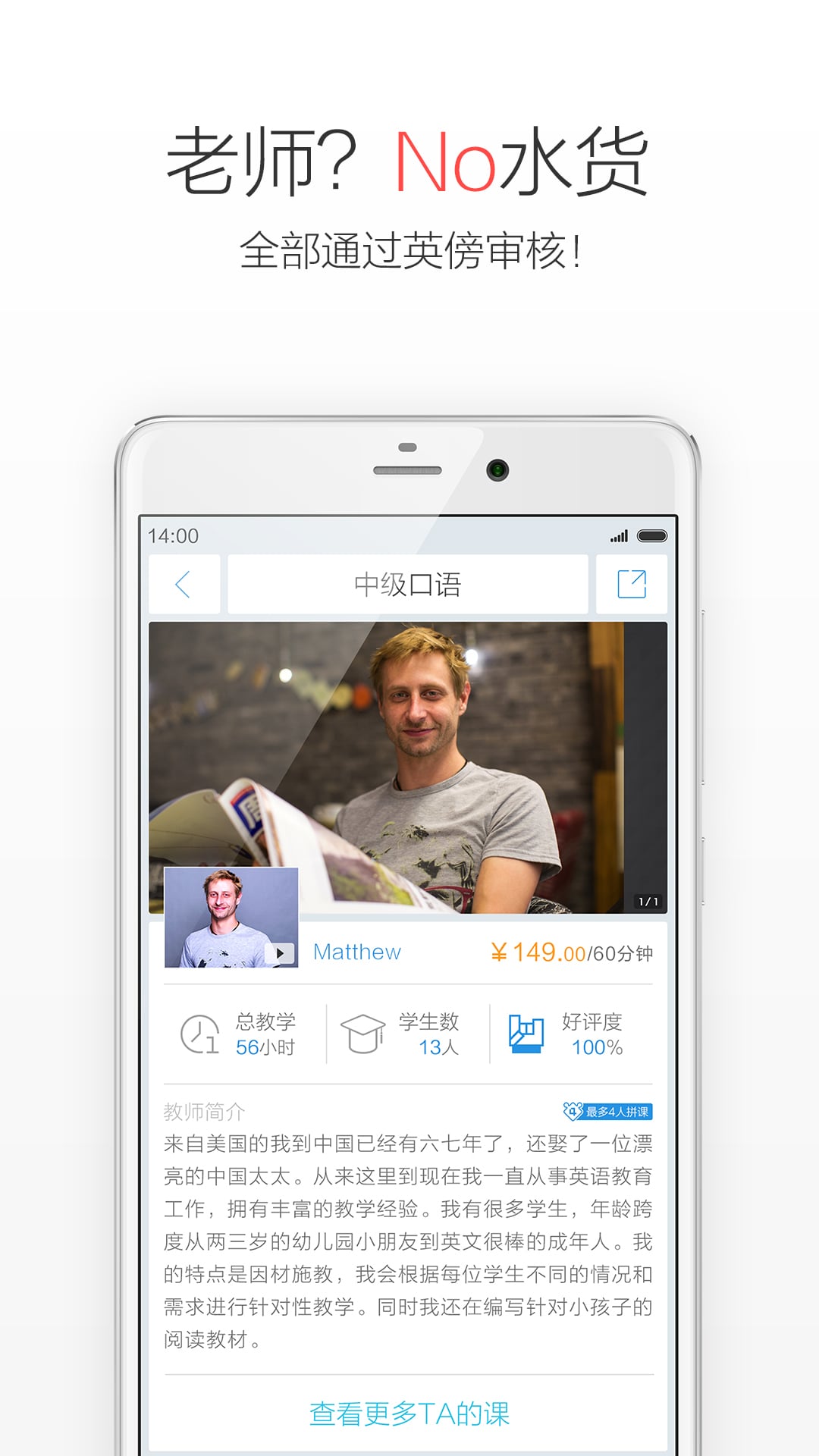 英傍外教app是一款关于外语培训的在线教育平台,用户通过英傍外教app可以随时在线选择外教老师,无需见面就可以面对面教学,价格更低,教学质量更佳,让用户享受愉悦的外教体验,轻松学好英语。