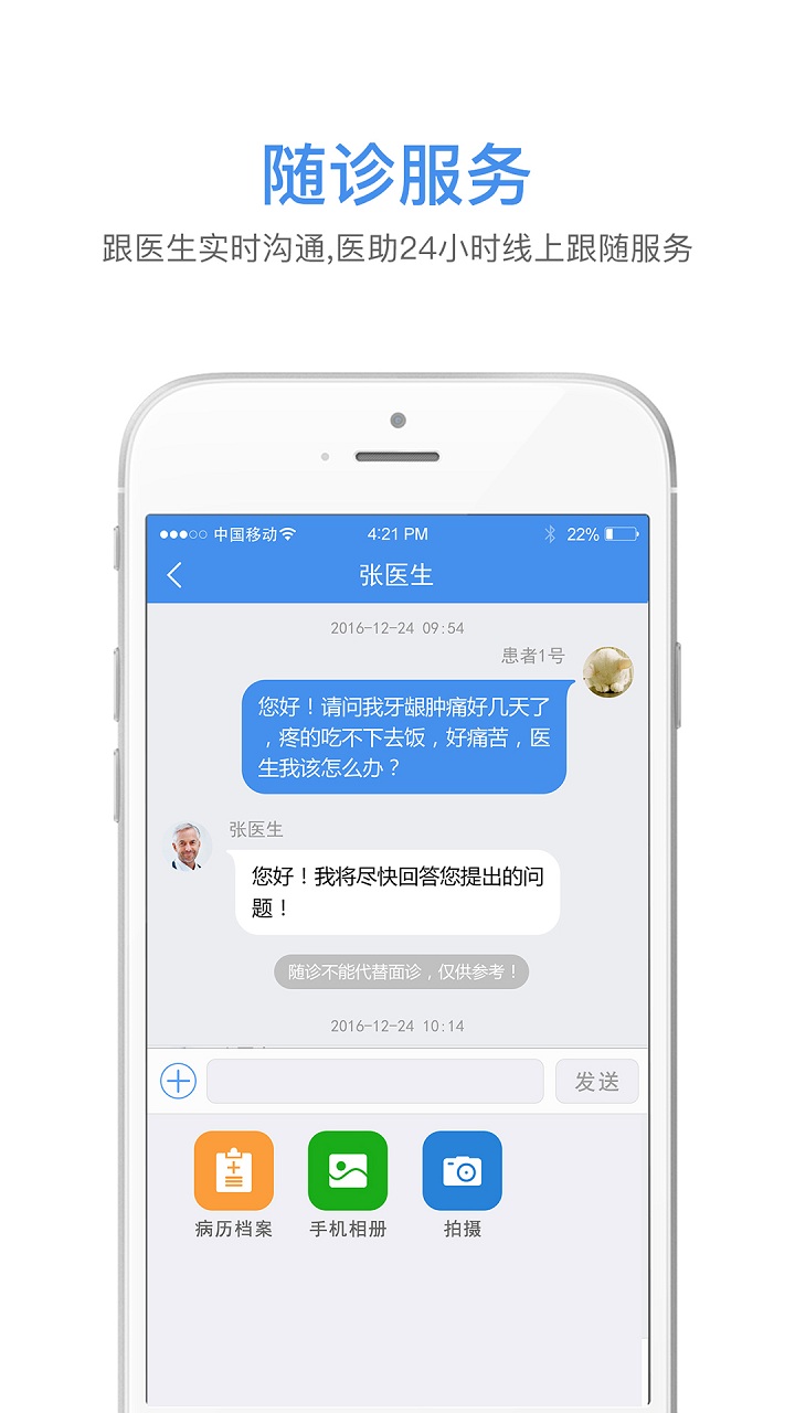 3、异地就诊病人,不用每次都长途跋涉,耗时耗力,只需添加您的随诊医生,便可以随时与他进行沟通交流。