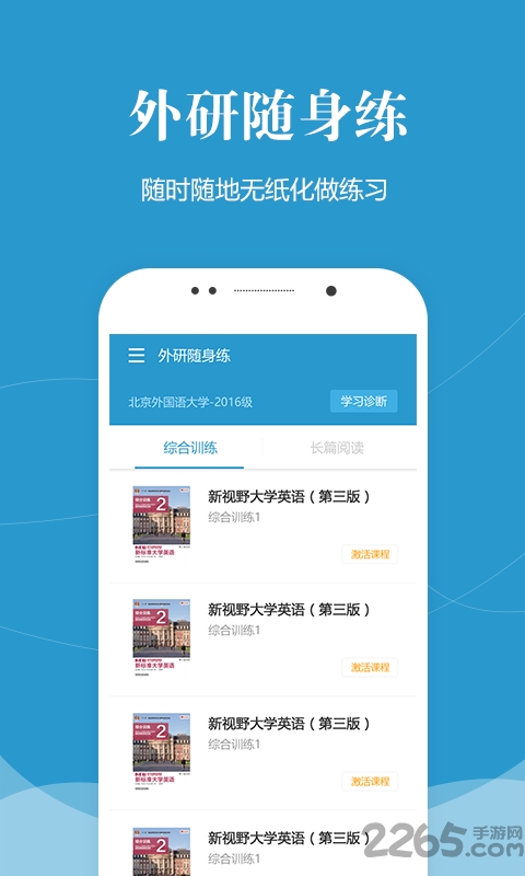 "外研随身练"是针对大学生群体推出的一款集习题训练、在线测试、学习评估于一体的手机应用。外研随身练App,帮你把教材放入口袋,随时随地,想学就学!