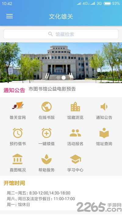 文化雄关安卓版是由雄关的市图书馆推出的关于图书管理的手机移动端。能够在线查阅图书馆的书籍借阅情况,能够手机进行图书的预约,了解关于图书馆的相关资讯以及图书馆发布的公告,有需要的小伙伴,可以来点击下载吧!