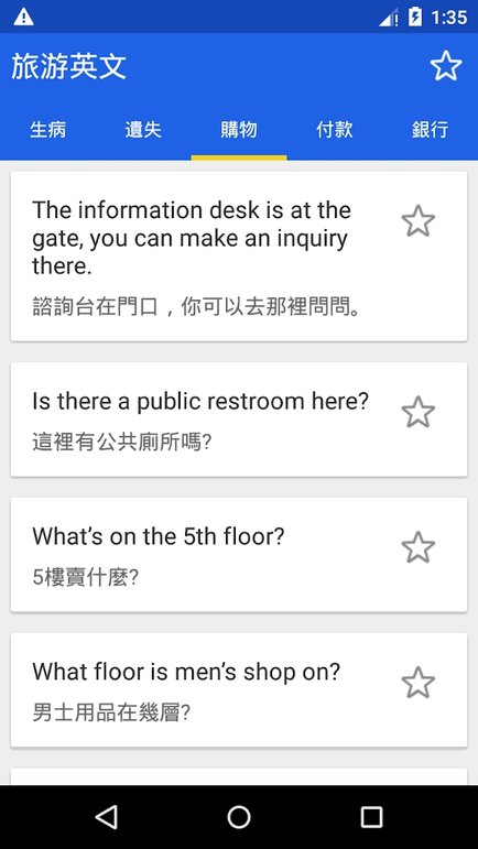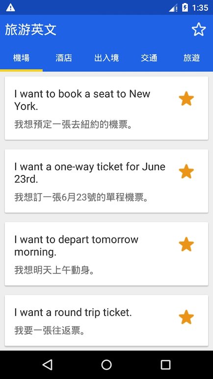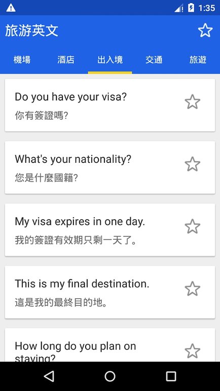 旅游英文300句依次分为飞机旅程、酒店住宿、交通、餐馆、购物等类型,每种类别提供旅行中最常用的中英文对照的句型,所选例句都以真实旅游场景为模板。支持英文例句发音,没有网路也可以使用。句子可加入收藏,方便快速查阅。