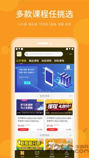 3.多款课程任你选择:公开课、精品课、学员课,直播、录播、面授