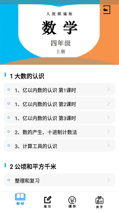 四年级数学上册人教版是人教版数学学习软件,可以代替纸质书本,通过手机即可学习到电子教材,每一个课时的知识都有讲解,标记章节后就能开启该章节的学习,预习和复习都不成问题,能及时巩固和强化知识。