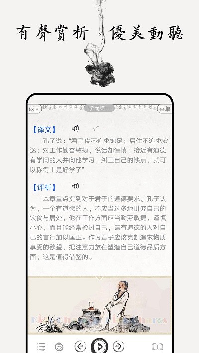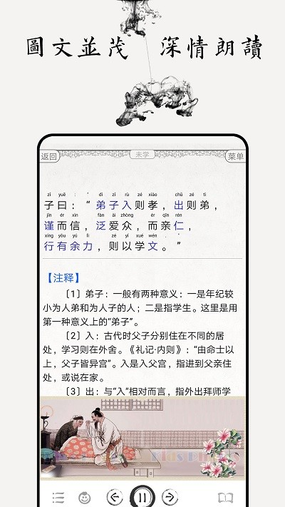 由爱好国学的团队所制作,表达儒家思想、体现古人智慧魅力为主,其内容以弘扬中国传统文化、老师深情的朗诵、完整的注释、甜美的译文、易懂的启示、准确的拼音、有趣的故事、水墨风插画、还有实用/易用的学习功能...使其声情并茂从而提升用户的阅读兴趣。