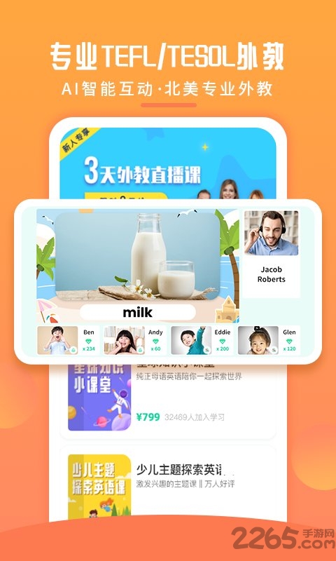 【浸入式教学】正课全英文环境,每天一个主题学习,不间断“浸入式”教学。北美外教将孩子带入纯英语母语环境。结合口语跟读、智能打分功能,摆脱哑巴英语。不光学英语,还要会应用,真正做到学过的句子都能说出来,走出国门无障碍沟通。