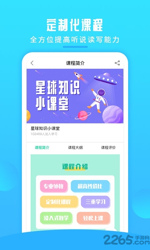 根据不同学生的学习需要,进行了详细的分类,总会有适合你的学习课程,足不出户就可以在线学习,这里的学习课程非常多,你可以根据自己的喜好来进行选择,可以从各个方面来提升孩子对英语的学习兴趣,平台提供大量英语课程,内容丰富,大量优质课程尽在其中,定制化课程,性价比超高,解决英语学习难题。
