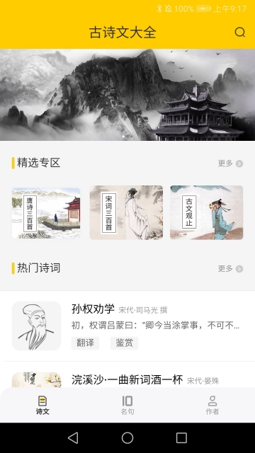 这是个十分好用的古诗词软件,在平台上面收录了唐诗1343首,宋词1338,元曲117首,每篇古诗古文文言文都配对了翻译与鉴赏,让您更容易品尝中华古诗古文文化的精髓与魅力。