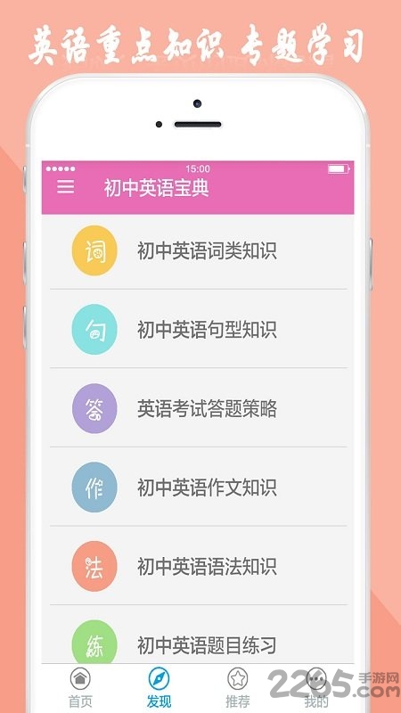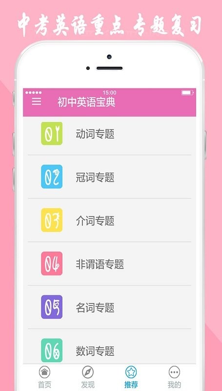 ★发现页面-{初中英语重点知识}:包含初中英语词性、句型、作文、语法、考题及答题策略等专题知识,帮助初中同学针对性的掌握英语难点、重点;