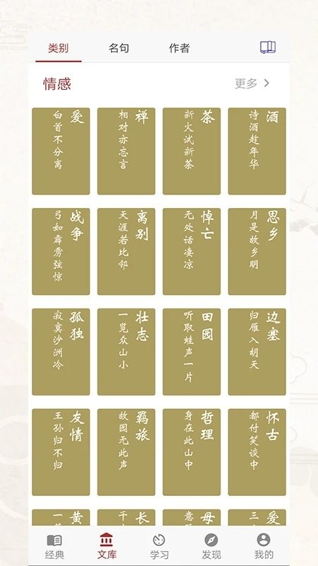 分类赏析 - 诗经全集、古诗十九首等选集,爱情、离别、思乡、壮志、田园等主题,春夏秋冬、山水日月等写景,中国传统节日与24节气。