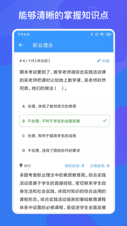 教师招聘资格证多练题库最新版是一个非常实用的手机教师证资格考试练习题库平台。在这里,用户可以直接通过本软件进行各种教师资格考试题型练习,平台内拥有海量模拟真考题目,同步实时更新,为用户提供便捷的考试练习服务。快来下载体验吧!