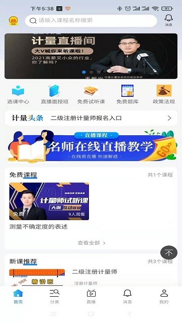 520计量平台是一款有关计量的综合性学习教育软件。查看所有推送的消息详情,进入应用首页,智能为你推荐课程,找到喜欢的课程,就能在线开始学习,还能以观看直播的形式进行学习,让学习变得更加的直观高效,在应用中就能做练习题,便于能够巩固自己的学过的知识,快来下载使用吧!