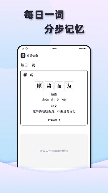 查询成语释义和成语学习。用户可以使用本软件查询成语具体的释义,包含读音、释义、例句、出处、近义词、反义词。同时用户还可以通过每日一词了解到新的成语,包含读音、释义、例句、出处、近义词、反义词,进行知识的学习,在此基础上,为用户提供方便快捷的成语查询软件。