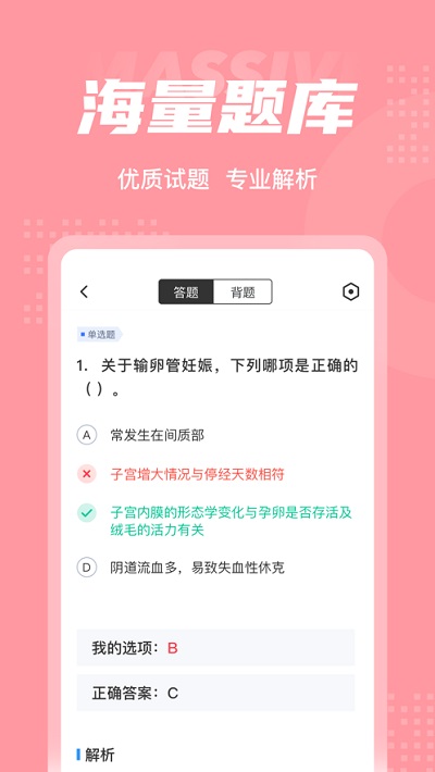 妇产科主治医师题库内含考点练习,全国通用卷以及地区卷模拟练习,以及按照固定考试比重的随机式的抽题的真题考场,成绩单实时记录考试数据,一点一滴的反馈考生近期学习状态以及自我正确率的提升,大大的给予考生通过考试的信心。